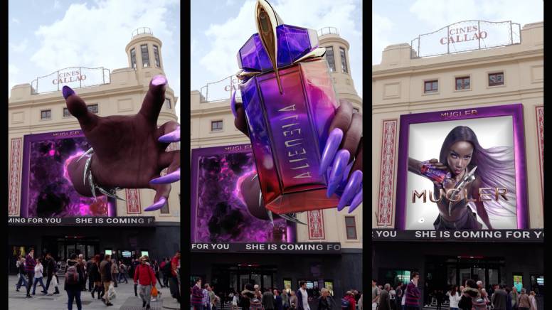 Una gigantesca mano femenina de uñas afiladas sobresale de la pantalla de Cines Callao para hacerse con el frasco de perfume anunciado en una lona colindante situada en la plaza. Es la llamativa acción CGI que Mugler ha puesto en marcha para anunciar Alien Hypersense, el nuevo perfume que la firma de cosmética acaba de lanzar al mercado.
