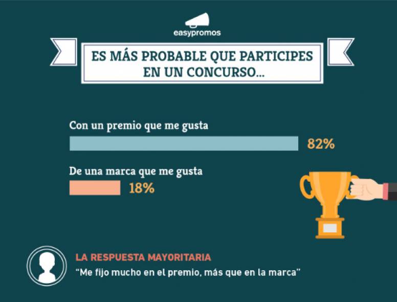 El 93% de los 1700 consumidores encuestados reconoce que participan porque hay premio. De hecho, el premio es lo más importante para el 48% de los encuestaos y para el 45% el principal factor de decisión. Por su parte, el poder de la marca no es tan importante para los consumidores, y solo el 18% de los encuestados afirman que la marca les invita a participar cuando para el 82% la participación la determina el premio.
