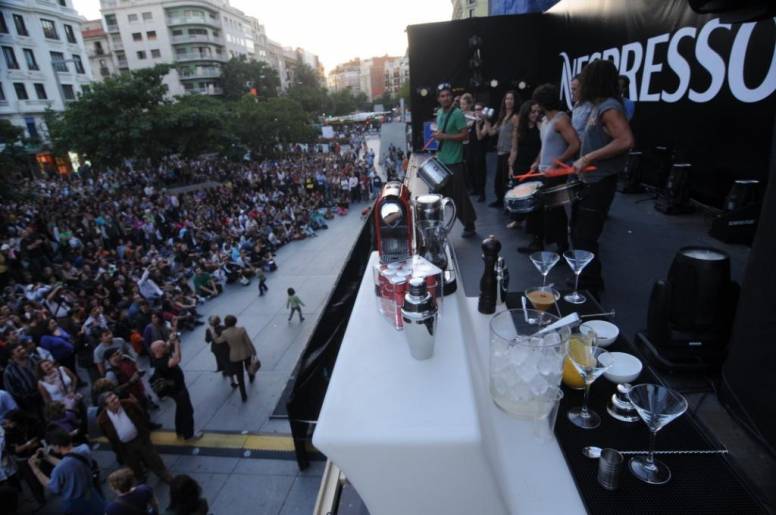 A la actuación personalizada de Mayumana se unieron músicos, bailarines y público en general, mientras en una pantalla gigante sobre la fachada de El Corte Inglés se mostraba al prestigioso cocktailman Javier de las Muelas y a su Dry Team preparando un Sitar, el exclusivo cocktail con el café Grand Cru Decaffeinato Lungo de Nespresso, que pudieron degustar los invitados de Nespresso en una carpa situada en la misma plaza.