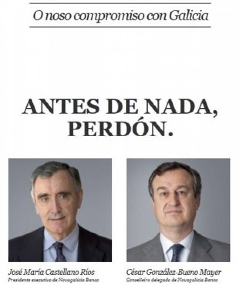 Y es que los nuevos dirigentes de la entidad financiera gallega, con José María Castellano y César González-Bueno (presidente y consejero delegado, respectivamente) han manifestado públicamente perdón a clientes y accionistas a través de anuncios publicitarios en la prensa, “por lo que se hizo mal en la etapa anterior”. Puntualizan que esa declaración no está motivada por su gestión al frente del banco, simplemente se ven “en la obligación”, de hacerse cargo de lo que está ocurriendo.