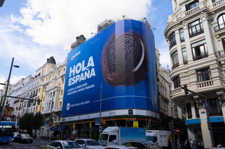 Madrid ha amanecido hoy con una lona en el centro de la ciudad en la que se lee “Hola España, llega la Oreo más deliciosa jamás creada”. La campaña, además de la enorme lona, cuenta con una producción de CGI que muestra una galleta caer del cielo para romper la anterior lona que, tras una explosión de cacao, es sustituida por la nueva.