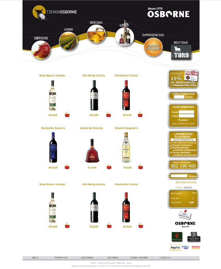 Osborne ha lanzado su tienda online en el site www.tiendaosborne.es, un canal concebido como herramienta de marketing donde los internautas podrán conocer mejor la compañía, adquirir una selección de productos de las diversas marcas de Osborne y contratar servicios exclusivos relacionados con la firma del Toro y su oferta en alimentación y bebidas.
