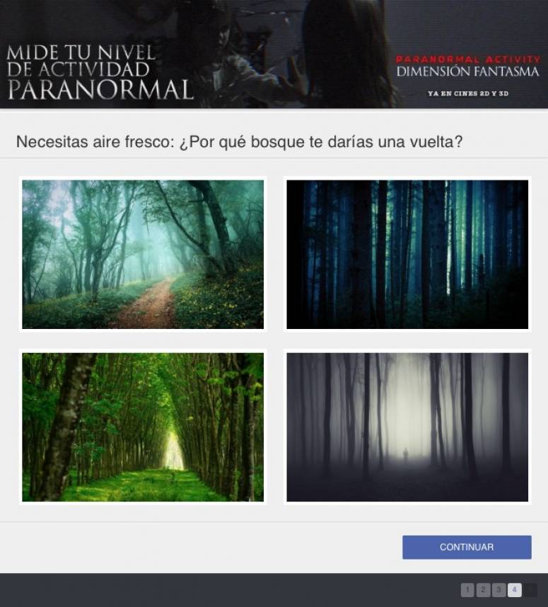 Con motivo del estreno de la última entrega de la franquicia Paranormal Activity, Paramount Pictures ha realizado una acción en Facebook. Concretamente a través de Esaypromos, la herramienta oficial de Facebook para la elaboración de promociones y concursos, Paramount ha lanzada una acción cuyo objetivo era potenciar la visibilidad de la película, incentivar la participación y generar viralidad a través de un test. Mediante un cuestionario, los participantes podían descubrir su grado de conexión con el mundo sobrenatural y averiguar si “eran un médium con poderes para entrar y salir del mundo paranormal a sus anchas” o, si por el contrario, “eran más terrenal que una piedra”. La estrategia se ha completado con un sorteo entre todos los participantes de cinco packs con DVDs de la saga Paranormal Activity.