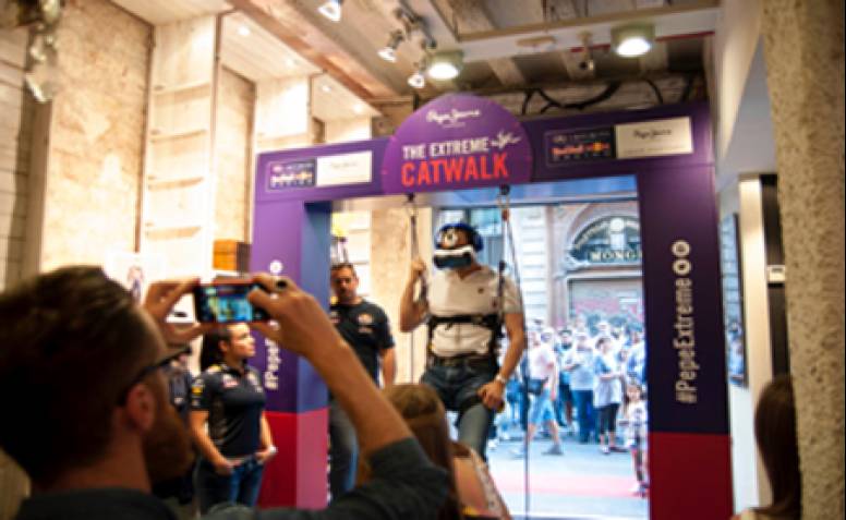 La marca de ropa Pepe Jeans London, con la colaboración de la agencia /drygital, presentó el pasado 11 de mayo en Barcelona, coincidiendo con el Campeonato Mundial de Fórmula 1, una experiencia virtual que permite a sus clientes saltar en paracaídas junto a los pilotos del equipo Infiniti Red Bull Racing Daniel Ricciardo y Daniil Kvyat.