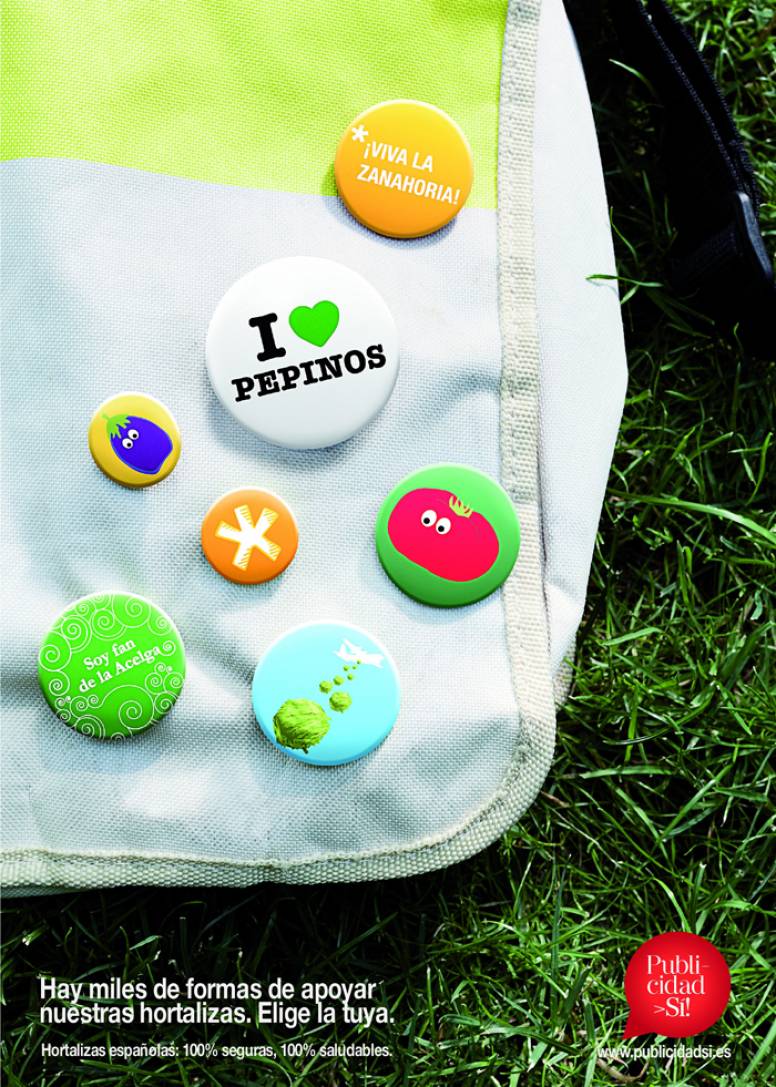 Para demostrar que la publicidad tiene más valores que los propiamente comerciales, favorece las causas nobles y hace a los consumidores más libres, la plataforma ¡Publicidad, Sí! ha dado su primer paso como formación a través de una campaña de promoción de las bondades de los productos hortofrutícolas españoles, que cuenta con el respaldo del Ministerio de Medio Ambiente y Medio Rural y Marino. Así, ‘Hay miles de formas de apoyar a nuestras hortalizas. Elige la tuya’, es según Rafael García Gutiérrez, miembro de la AEA, una campaña “no oportunista, sino oportuna”, con la que recuperar la imagen de estos productos, y al mismo tiempo presentarse a la sociedad como un valuarte de la productividad y riqueza del país, así como de su cultura. Este carácter bicéfalo, según el presidente del Club de Creativos, Ezequiel Treviño, ha hecho necesario que la campaña fuese “empática con la administración y con la sociedad”, así como económica y fácil de implementar. De esta forma, y con un presupuesto de 1,5 millón de euros financiado íntegramente por la plataforma, ha iniciado su andadura en medios impresos, digitales, exterior y radio durante los dos próximos meses; si bien tiene previsto hacer acciones puntuales en comercios, donde está previsto el reparto de chapas con lemas como ‘me importa el pepino’ o ‘viva la zanahoria’.