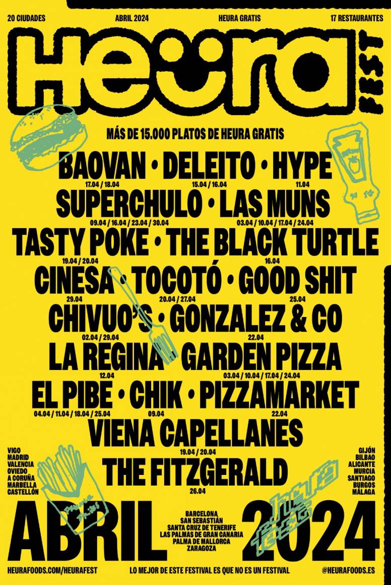 El Heura Fest, celebrado durante todo el mes de abril, ha reunido un total de 18 establecimientos como Deleito, Viena Capellanes, Cinesa, The Fitzgerald, Garden Pizza, Superchulo o Tasty Poke, entre otros, en 31 ciudades de toda España.