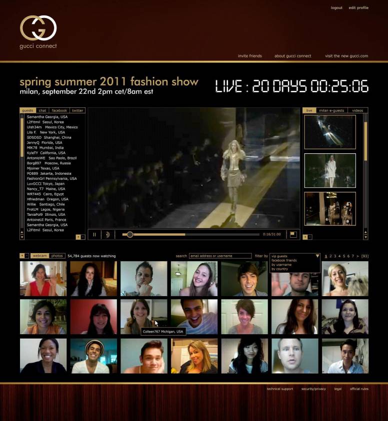 A partir del 30 de agosto, los invitados virtuales pueden inscribirse en gucciconnect.com para recibir un e-ticket que les dará acceso al E-vent en tanto que asistentes virtuales al desfile de la colección femenina Primavera/Verano 2011 de Frida Giannini, que tendrá lugar en Milán el 22 de septiembre de 2010. Según sus responsables, Gucci Connect E-vent ofrecerá las mismas prestaciones a los invitados virtuales que a los invitados de Milán con la presentación en directo del desfile, asientos virtuales con vídeos webcam compartidos en el espacio Gucci de la pasarela así como ocasiones para establecer contactos. A través de la tecnología webcam de Gucci Connect, los invitados virtuales se mezclarán con los compradores y la prensa de todo el mundo que regularmente asisten a las pasarelas de Nueva York, Londres, Milán y París.