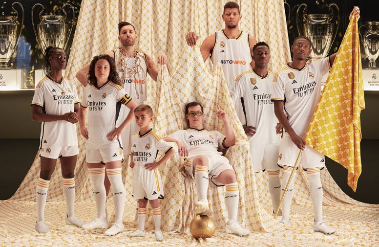 En 23/24 da comienzo la Liga Genuine Santander, una liga formada por equipos con jugadores con alguna discapacidad intelectual cuyo germen se plantó hace 6 años. Para celebrarlo, este año la familia del Real Madrid sitúa en el centro de la foto a Javier, jugador de la liga Genuine. Le acompañan representantes de otros equipos como el Real Madrid femenino, baloncesto y la Youth Academy. Jugadoras como Ivana, con su brazalete de capitana del equipo femenino; la delantera Naomie Feller con un colgante dorado (con la palabra ‘grandeza’ grabada) comparten plano con jugadores del equipo de baloncesto como Walter Tavares o Rudy Fernández, con la red de una canasta cortada tras una victoria y jugadores de la academia de Real Madrid, canteranos que representan el futuro del club. Cerrando la fotografía se encuentra David Alaba, portando una bandera con motivos dorados, que recuerda a los patrones empleados por las marcas de alta costura.