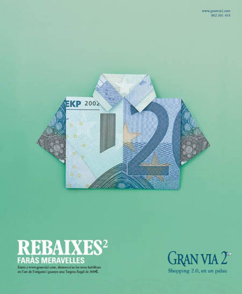 El Centro Comercial Gran Vía 2, de la mano de la agencia BUM - Blasi, Urgell, Morales, promociona su campaña de rebajas 2010 a través de un concurso de papiroflexia.