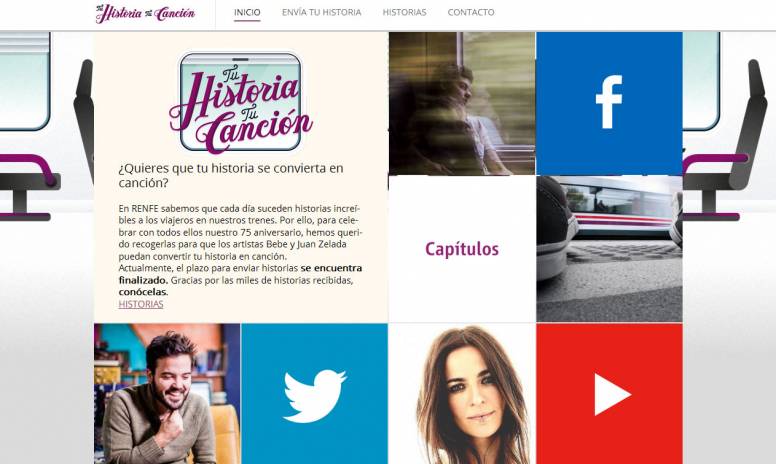 La campaña "Tu historia, tu canción", impulsada a principios de año por la marca Renfe como un desarrollo digital dentro de su campaña global por su 75 aniversario (ver información relacionada aquí) encara su último tramo, el de resolución. La acción bebe del marketing social ya que ha tenido como protagonistas a fans, usuarios y viajeros de tren en España en una iniciativa que ha tenido por objetivo aunar las emociones de las personas que viven el tren con el mundo de la música, conectándolos a través de las redes sociales y el universo digital. A medio caballo entre la promoción y el marketing colaborativo, la campaña gira en torno a la web www.tuhistoriatucancion.com, en la que se han recogido historias de viajes que sirvan como inspiración para que dos artistas españoles (en este caso Bebe y Juan Zelada) creen una canción totalmente nueva y original donde se plasmen esas sensaciones que produce un viaje en tren para las personas.