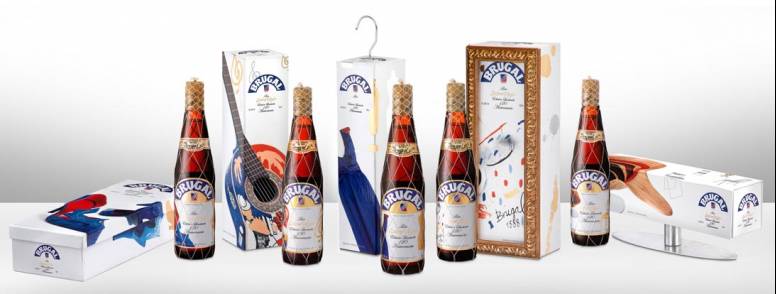 El diseño de las botellas y sus cajas está inspirado en la obra original que los 5 artistas españoles, rememorando las 5 generaciones de la familia Brugal, idearon para expresar lo que la marca y el escudo les transmitía: un par de zapatos realizados en piel de serpiente (Laura Ponte), un vestido de satén de seda (Miguel Palacio), una guitarra (Natalia Jiménez), una “chaise-longue” (Héctor Ruiz) y una obra pictórica (Óscar Jaenada).