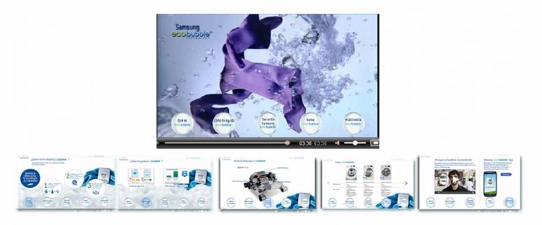 La campaña de Samsung EcoBubble se articula en dos spots producidos ad-hoc por Publimedia Gestión con dos prescriptores de Mediaset España: el presentador de Cuatro Juanra Bonet (“Lo sabe, no lo sabe”) y la jefa de estilismo del grupo Mate Méndez de Vigo, autora del blog de Telecinco.es “Estilista de guardia”. Ambas piezas esconden un microsite interactivo al que el usuario accede a partir de distintas burbujas que sobresalen desde la barra del timeline en tiempo real al visionado de los spots. Al pinchar en ellas, el espectador entra en una nueva dimensión del producto descubriendo información y contenidos adicionales sobre el mismo, sin abandonar en ningún momento el visor en el que se proyecta la campaña.