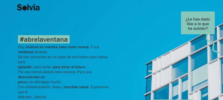 Debido a la situación de confinamiento que vive el país, palabras como el desánimo o la soledad pueden convertirse en protagonistas del día a día. Para ayudar a combatir los sentimientos negativos, la firma de servicios inmobiliarios Solvia ha decidido dar un paso adelante y crear la plataforma digital "Abre la ventana". Se trata de una iniciativa cuyo principal propósito es enviar mensajes positivos, agradecer y apoyar en estos momentos tan excepcionales que estamos viviendo.