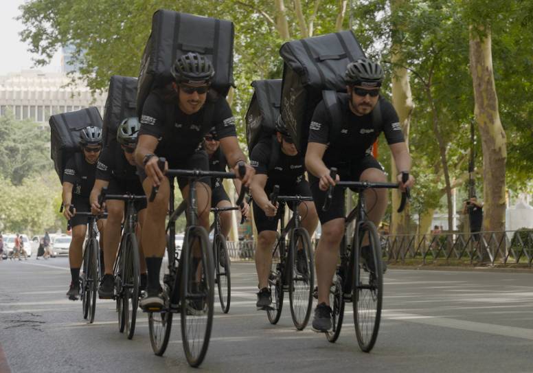 El vídeo principal de la campaña “Delivery a la Vuelta” muestra un pelotón de repartidores equipados con ciclistas profesionales recorriendo las calles de la capital sobre sus bicicletas