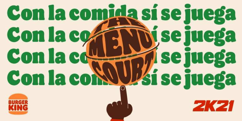 Burger King desafía a los gamers a jugar y comer como nunca con The Menu Court. Con esta iniciativa la marca quiere invitar a disfrutar de deliciosos premios de manera gratuita a todos aquellos que encesten desde las diferentes posiciones de la cancha, customizada con imágenes de los icónicos productos de la marca, desde diferentes posiciones. Cuanto más complicado es el tiro, mejor es la recompensa (Nuggets de pollo, Cubo de patatas clásicas, Big King XXL, Long Chicken o el clásico Menú Whopper). Además, la marca reta a que prueben su cancha en el juego NBA2k21 a gamers referentes dentro del sector como RobertPG, Papigavi o Vituber entre otros.