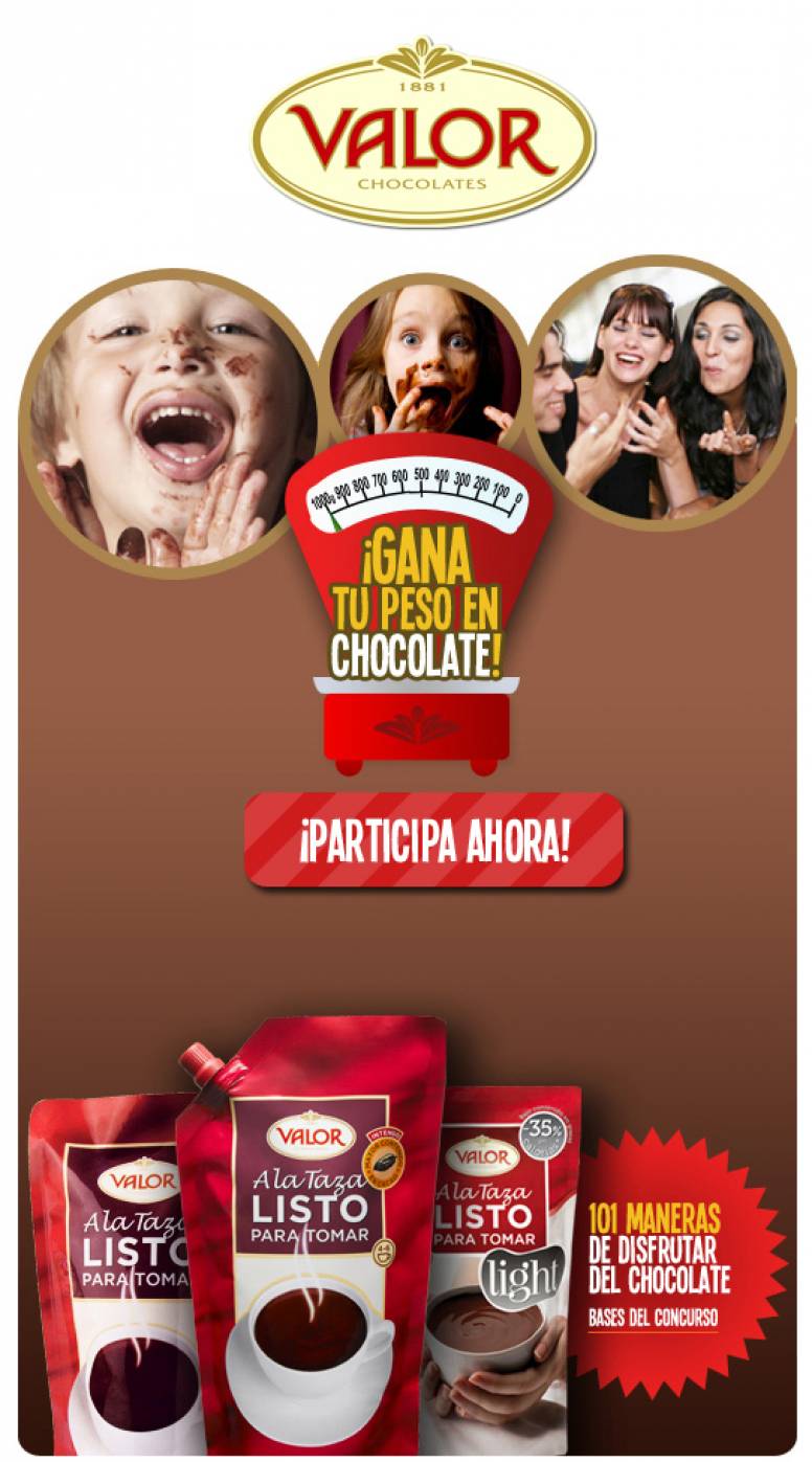 La marca Chocolates Valor ha centrado su última acción en redes sociales y concretamente ha escogido Facebook para regalar a sus consumidores su peso en chocolate. Sólo podran ser dos los afortunados obsequiados con su peso en 'Chocolate a la taza listo para tomar' en cualquiera de sus variedades y para conseguirlo, los participantes deberán escribir un comentario en el perfil que la marca tiene en Facebook sobre su original manera de comer chocolate. Así, y entre todos los comentarios que se reciban hasya el próximo día 2 de enro, el jurado eligirá a uno de los ganadores, y los usuarios a otro.