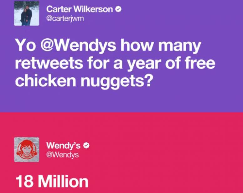 Todo comenzó cuando Carter, un estudiante norteamericano envió un tuit a @Wendys preguntando cuántos retuits necesitaba para conseguir un año de nuggets gratis. Wendy’s lo cifró en 18 millones y a partir de ahí, muchos tuiteros han entrado en la conversación para apoyar la petición de Carter. Aprovechando la ocasión, Wendy’s ha anunciado que donará en nombre de Carter 100.000 dólares para una fundación de niños de acogida si el tuit de Carter supera el número de retuits que consiguió el selfie de Ellen DeGeneres en los Oscar.