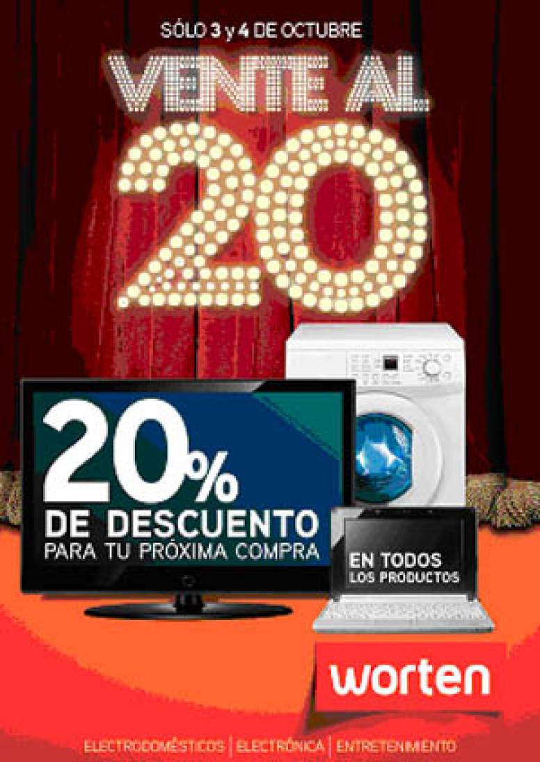 La promoción Vente al 20, consistía en devolver al cliente un 20% del importe de su compra en dinero Worten para ser utilizado en su próxima compra. Se trata de una campaña multimedia: prensa, radio, fachadas tiendas, portada folleto Worten, plv, online y por primera vez también en televisión.