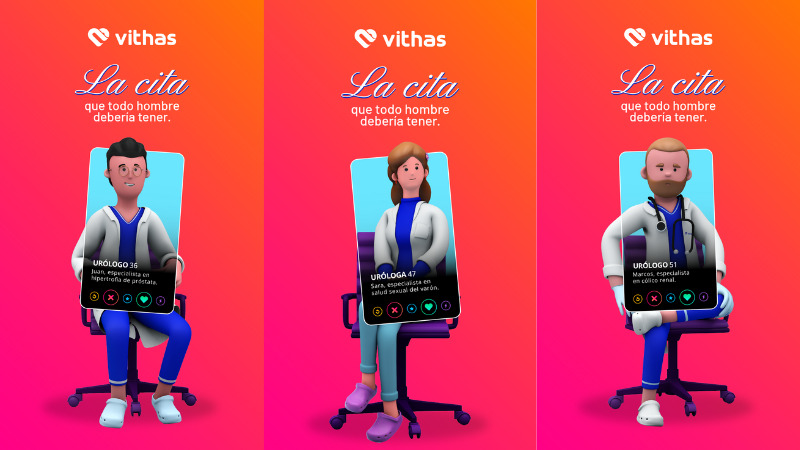 Inspirada en la conocida aplicación de citas Tinder, la nueva campaña de Vithas nos muestra a varios urólogos, su edad y su especialidad, como cáncer de próstata, cólico renal o salud sexual, que se convierten automáticamente en “match” al hacer “swipe” automático hacia la derecha. El siguiente paso es… una cita. Y es que, además de redes sociales y canales propios del grupo hospitalario, la campaña se ha lanzado en la propia app Tinder y otros medios de pago.