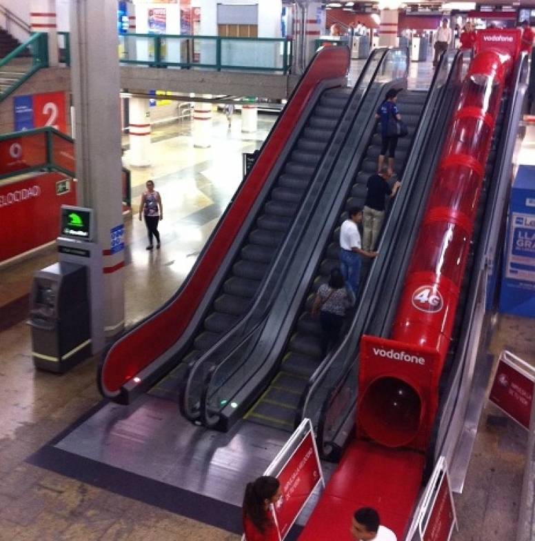 Como cada mañana, miles de madrileños se desplazan en Metro a sus puestos de trabajo. Desde hoy, 5 de julio, y hasta el próximo día 15, los madrileños y usuarios de la estación Vodafone Sol, podrán cambiar su rutina y, en lugar de bajar las escaleras mecánicas, bajar por los toboganes que se han instalado. De la mano de OMD, Vodafone sigue comunicando el lanzamiento de la cobertura 4G aprovechando el verano y las rebajas en la zona más comercial de Madrid.