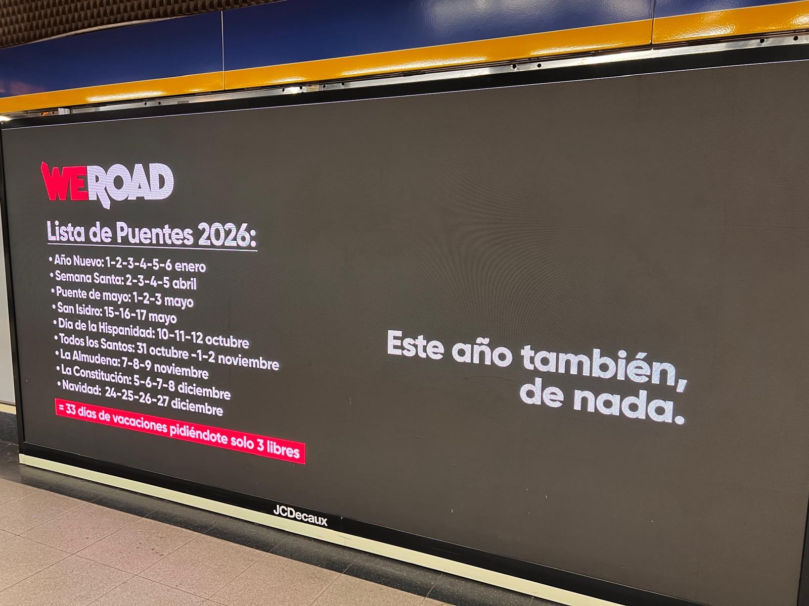 WeRoad ha vuelto a activar su campaña de inicio de año con el ‘Listado de Puentes 2026’, una acción de publicidad exterior (OOH) y digital (DOOH) en el metro de Madrid y Barcelona que busca inspirar a los viajeros a estirar sus vacaciones con una planificación ajustada al calendario de festivos.