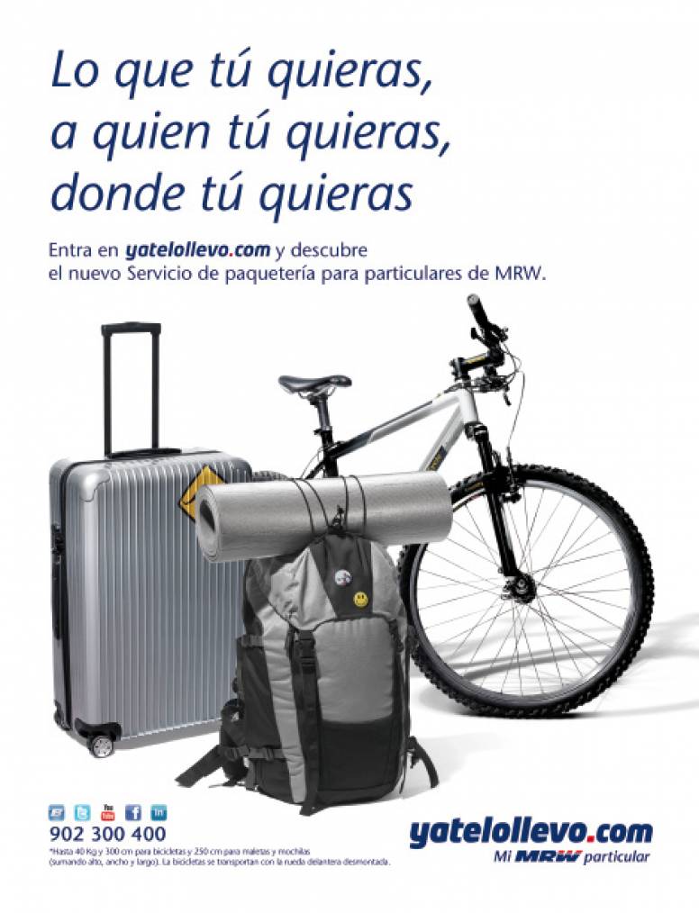 Bajo el claim de "Lo que tú quieras, a quien tú quieras y donde tú quieras", MRW presenta ‘yatelollevo.com’, un servicio de paquetería que nace con el objetivo de satisfacer las necesidades inmediatas y ocasionales de los consumidores particulares, fundamentalmente de cara al verano. El servicio se estrena este verano con una promoción de lanzamiento que permite enviar a cualquier punto de España peninsular y Andorra bicicletas, maletas y mochilas con precios especiales.