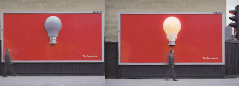 La valla publicitaria del periódico británico The Economist pretende la promoción del semanal y la adhesión de nuevos lectores, y a tal fin utiliza una bombilla, integrada en la valla, que se ilumina cada vez que un viandante pasa por debajo de la lámpara de incandescencia. La función referencial del objeto es la de representar al periódico que «ilumina», pero también a sus lectores que, gracias al semanal, tienen buenas ideas o, simplemente, son inteligentes. Quizá la propuesta resulte menos persuasiva con aquellos viandantes con tendencia a sobrestimar sus propias habilidades (efecto Dunning-Kruger), es decir, con todas aquellas personas con alta densidad existencial que creen portar una bombilla permanentemente encendida sobre la cabeza, capaz de iluminar la ignorancia ajena, mas no la propia.