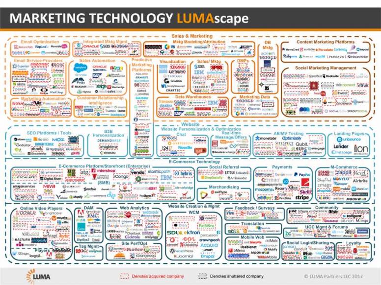 Es tan amplio el espectro de tecnologías a nuestra disposición a día de hoy que aunque quisiéramos sería inabarcable para una agencia contar con todas ellas o tan siquiera probarlas. Como dice el refrán, en este caso, “el que mucho abarca poco aprieta”. No hay más que echar un vistazo a alguno de los landscapes de Luma Partners: http://www.lumapartners.com/resource-center/lumascapes-2/ para darnos cuenta de la enorme fragmentación que existe en las tecnologías al servicio del marketing.