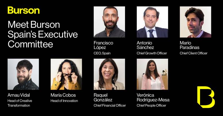 Burson ha anunciado la composición del nuevo Comité Ejecutivo (ExCo) de la compañía, capitaneado por Francisco López, chief executive officer del Grupo, que cuenta con 7 miembros: Antonio Sánchez, chief growth officer; Mario Paradinas, chief client officer; Arnau Vidal, head of creative transformation; María Cobos, head of innovation; Verónica Rodríguez-Mesa, chief people officer; y Raquel González, chief financial officer.