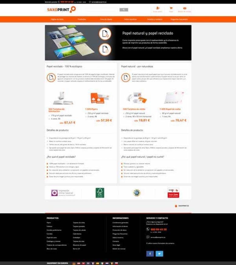 Gracias a la reciente introducción del papel natural y reciclado que puede escogerse, entre otras cosas, para cartas, flyers, postales y tarjetas de visita, Saxoprint garantiza a sus clientes productos impresos con conciencia en el medio ambiente.
