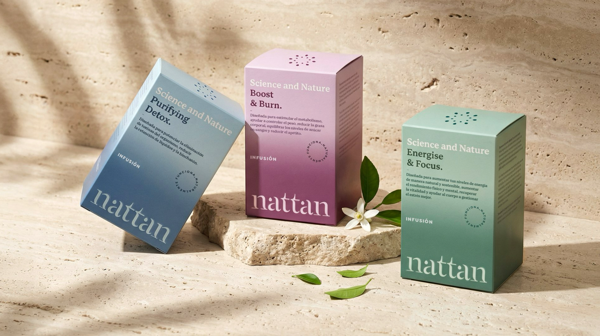 El claim de la marca, ‘Funciona naturalmente’, pone el foco en el poder de la naturaleza y el trabajo científico de Nattan. El resultado es un sistema de diseño de packaging claro que permite el crecimiento y la ampliación con más rituales de una forma ágil y fácil.