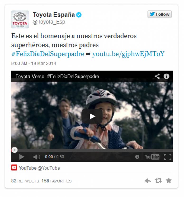 Uno de los objetivos de Toyota en 2014 se ha centrado en sorprender a los consumidores conectados, crear notoriedad de sus coches y posicionar a la marca de un modo más emocional. Para esta última labor, han relacionado a la marca con la relación existente entre padres e hijos, y para ello han desarrollado una acción vinculada a la celebración del Día del Padre. Para ello se creó el hashtag #FelizDíaDelSuperpadre, lanzado precisamente el 19 de marzo y un vídeo dedicado especialmente a todos los padres.