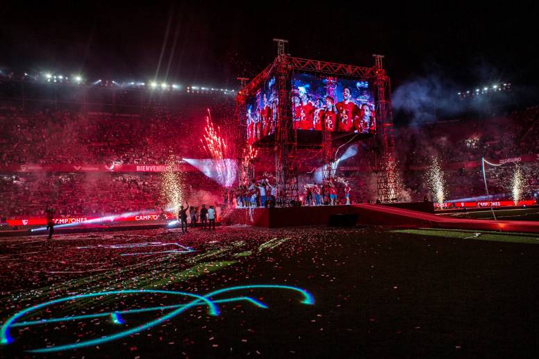 La noche del jueves 1 de junio, celebraban un macroevento organizado para 50.000 personas, el cual ha sido puesto en marcha con tan solo cinco días de antelación, suponiendo todo un reto para la agencia de comunicación y eventos sevillana. Posicionando al escenario como el corazón de la celebración, apostaron por una puesta en escena totalmente diferenciadora, dinámica, visual y versátil, que constaba de dos grandes provocadores que por primera vez fueron desde el centro del campo en dirección a las distintas porterías, otorgando mayor protagonismo y accesibilidad de los jugadores y protagonistas, a todos los aficionados del SFC.