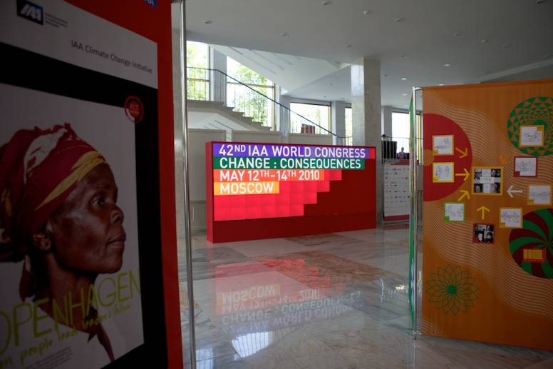 El 42º Congreso Mundial de la IAA, celebrado por primera vez en Rusia, ha coincidido con el lanzamiento al mercado ruso de la nueva tecnología de visualización Christie MicroTile, instalados en el evento por el partner técnico, The Big Screen Service (BSS) Company. En total se instalaron tres estructuras modulares de visualización MicroTiles, que combinan las ventajas de las tecnologías LED y DLP. "Ninguna otra tecnología de visualización habría logrado más que una presentación de compromiso, pero con MicroTiles conseguimos crear una imagen luminosa y atractiva, al nivel de las expectativas de los profesionales de la publicidad”, señala Evgeniy Marinichev, director técnico de BSS. El vestíbulo del palacio ha sido escenario de otras dos muestras patrocinadas por las autoridades de Moscú y por la sección ejecutiva del comité de dirección nacional del congreso, en colaboración con las principales asociaciones de la industria de comunicación rusa. La primera de ellas presentó los mejores ejemplos de publicidad social de ACT Responsible, mientras que en la segunda se exponían las obras ganadoras del concurso Remember the Great Victory.
