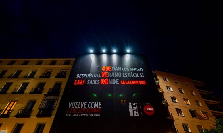 Coca-Cola Music Experience comienza a tomar forma y, desde el pasado fin de semana, los fans ya conocen los nombres de los primeros artistas que se subirán al escenario del festival de Coca-Cola los próximos 1 y 2 de septiembre en el Nuevo Espacio de Festivales de Madrid. Algunos de estos nombres, además, se han desvelado de una forma muy especial: a las 21:30h del pasado viernes, una gran lona desplegada en la madrileña Plaza de la Cebada se iluminaba para revelar en primicia, a través de un juego de palabras con neones, la identidad de algunos de estos primeros artistas. Una sorpresa que los fans no tardaban en inmortalizar para compartir en sus redes sociales.