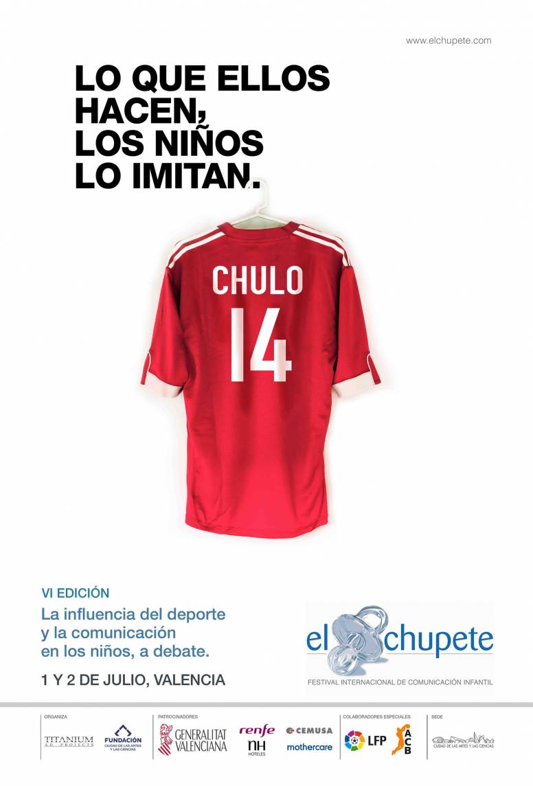 La sexta edición del Festival Internacional de Comunicación Infantil El Chupete, que se celebrará en la Ciudad de las Artes de Valencia el 1 y 2 de julio, versará sobre la influencia del deporte, los deportistas y la comunicación en los niños. Así, durante dos días se podrán ver anuncios con un componente deportivo y, con la participación de deportistas, ex deportistas, periodistas y anunciantes, entre otros, y se analizará la relación entre deporte, comunicación y niños. El cartel de este año muestra una camiseta de un deportista donde se ha sustituido su nombre por adjetivos, buenos y malo, asociados a él. Con esta idea se ha pretendido generar un debate sobre la influencia que tiene sobre los niños el comportamiento de los deportistas fuera y dentro del campo y la imagen que transmiten a través de los medios de comunicación; todo ello bajo el slogan 'Lo que ellos hacen, los niños lo imitan". Esos comportamientos y adjetivos que se asocian a los deportistas tampoco son ajenos para las marcas. De hecho la apuesta por un deportista de élite asegura una repercusión para la marca, de esta forma tanto el anunciante como el deportista deben comunicar una serie de valores unificados y cercanos a los niños.