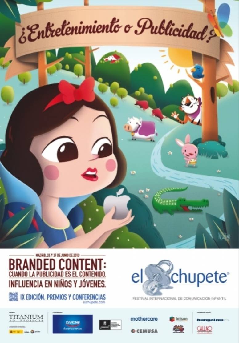 Bajo la pregunta ‘¿Entretenimiento o publicidad?, el Festival El Chupete presenta el cartel oficial de su novena edición, en el que el branded content será el tema protagonista. Este año, el Festival invita al debate sobre la irrupción de esta nueva tendencia de comunicación en los contenidos de entretenimiento hacia los más niños y adolescentes. Así pues, más allá de que el público sepa o no qué es branded content, el cartel de esta IX edición lanza un mensaje claro sobre las nuevas tendencias de comunicación en las cuales la publicidad deja de ser intrusiva y pasa a ser el contenido”, según comenta Rodrigo Ron Director de El Chupete. La campaña, presente en las marquesinas de más de 30 ciudades españolas, ha sido desarrollada por la agencia de comunicación Bungalow 25 y la ilustración es obra del artista Paco Pereira Ajenjo.