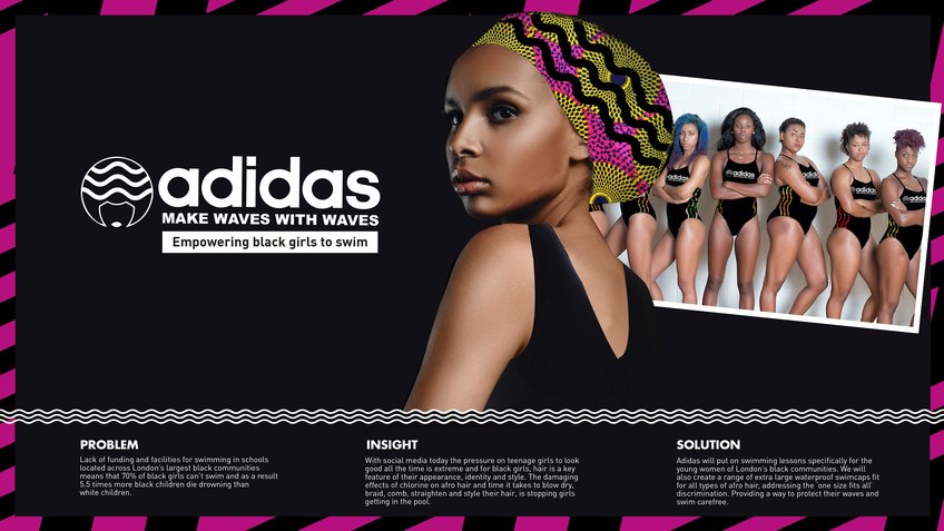 Savannah Finestone y Jack Parker, alumnos del West Herts College, han sido galardonados con un Black Pencil por su proyecto creado a partir de un brief de Adidas. ‘Make Waves With Waves’ tiene el objetivo de capacitar a las chicas de raza más oscura con clases gratuitas de natación y una gama de gorros y productos para el cuidado del cabello diseñados para todos los tipos de cabello negro. El 70% de las mujeres negras no pueden nadar debido a la condición de su pelo, que les ha llevado a una discriminación en cuanto a tallas de gorros. De este modo, las féminas podrán dejar de preocuparse por las ‘waves’ de su pelo para solo tener que preocuparse por las de la piscina.