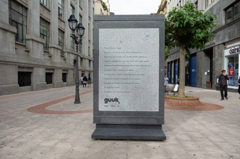 Pieza: Mupi de piedra de dos toneladas sobre el que se ha tallado de forma artesanal el manifiesto del operador.