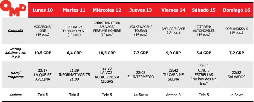 Dos espacios de Tele 5 que arrasan en audiencia en sus respectivos días son los que otorgaron los mayores ratings publicitarios de la semana, según indica el informe semanal de OMD-Kantar. Prácticamente igualados pero por cuestión de centésimas, el spot de oro semanal se lo llevó con 10,5 Grp’s la campaña Chrsitian Dior/Sauvage proyectada el miércoles en el talent show musical de “La Voz”.