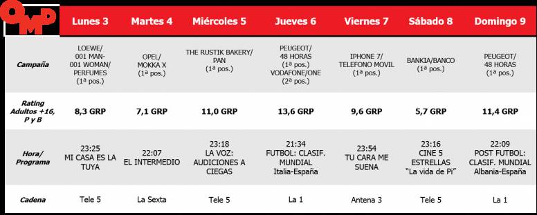 Según el informe semanal de OMD basado en datos de Kantar, los partidos de "La Roja" de clasificación para el próximo Mundial, emitidos por La1, obtuvieron los mejores rantings publicitarios de la semana. El partido del jueves que enfrentó a los de Julen Lopetegui ante la Selección de Italia, arrasó con más de 5,3 millones de telespectadores mayores de 16 años (34,7%) y proporcionó el spot de oro semanal con 13,6 Grp’s a las campañas Peugeot y Vodafone One.
