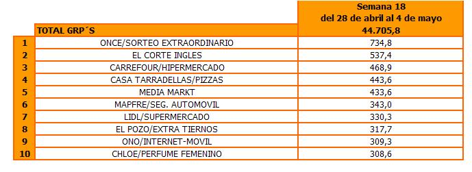 Top 10 Campañas Publicitarias (Grp's adultos - PyB) del 28 de abril al 4 de mayo de 2014