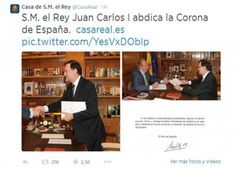 La @CasaReal ha utilizado Twitter como canal oficial para anunciar la abdicación del Rey. El tuit lanzado a las 10:39h ha conseguido en tan solo una hora 21.256 retuits y 3.490 favoritos. En los primeros 38 segundos ya había conseguido 585 retuits.