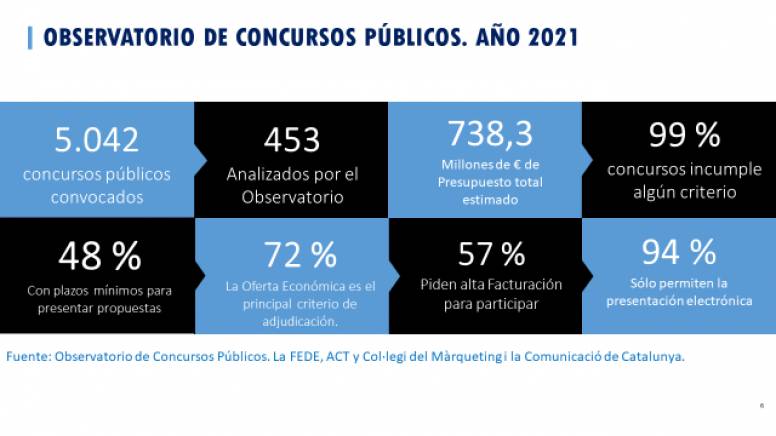 En 2021 La FEDE ha informado a sus asociados de un total de 5.042 concursos públicos convocados por todas las administraciones que solicitan directa o indirectamente servicios relacionados con la publicidad y la comunicación.