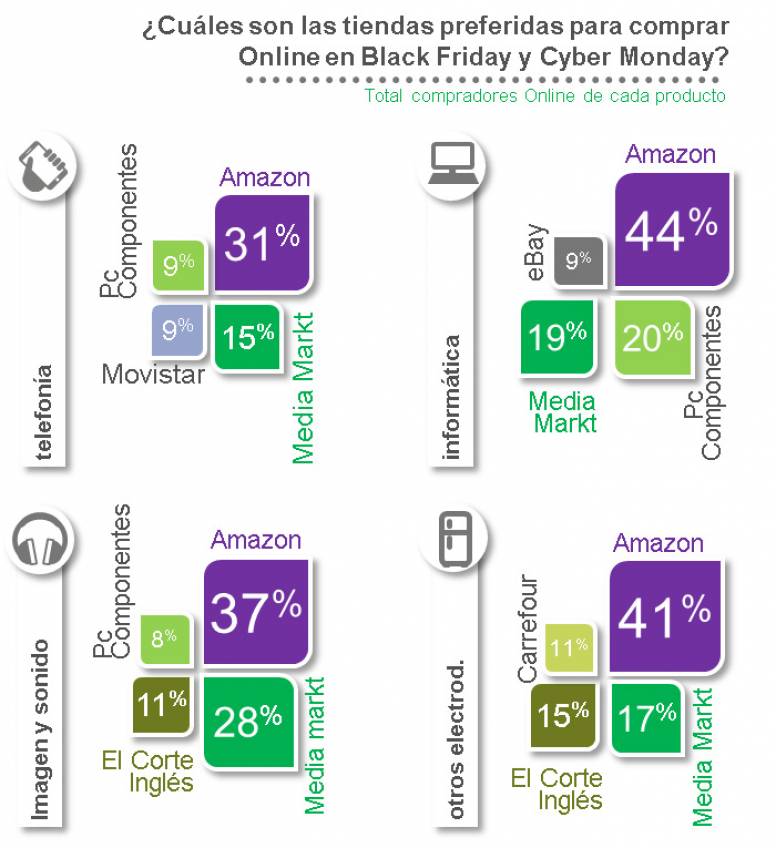 Aunque Amazon es la tienda online en la que más internautas declaran que comprarán, el ranking es diferente en función del tipo de producto. Así, en Informática, el 2º puesto es para PcComponentes (20%) seguido de Media Markt (19%) y de Ebay (9%). En Telefonía el 2º puesto es para Media Markt (15%) seguido de Movistar y de PcComponentes (ambos con un 9%). Y en Imagen y sonido y otros electrodomésticos, el 2º puesto es para Media Markt (28% y 17%), respectivamente, seguido en ambos casos por El Corte Inglés (11% y 15%, respectivamente). El 4º puesto en Imagen y Sonido es para PcComponentes (8%) y en otros electrodomésticos para Carrefour (11%).