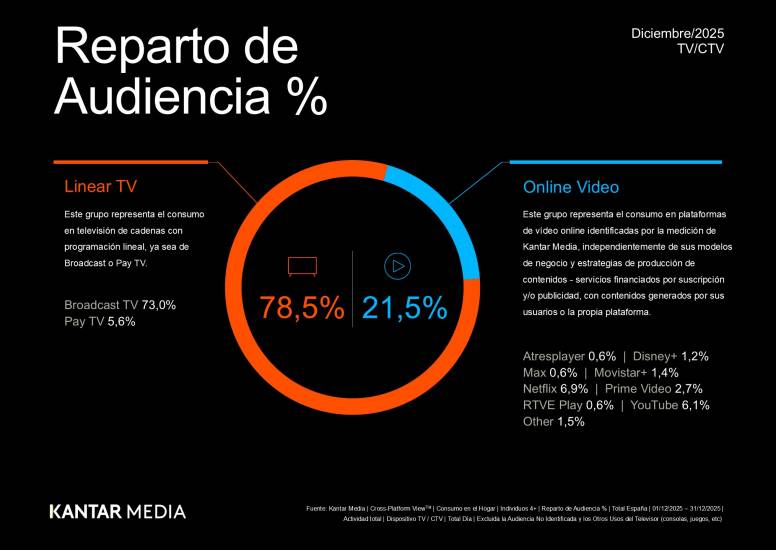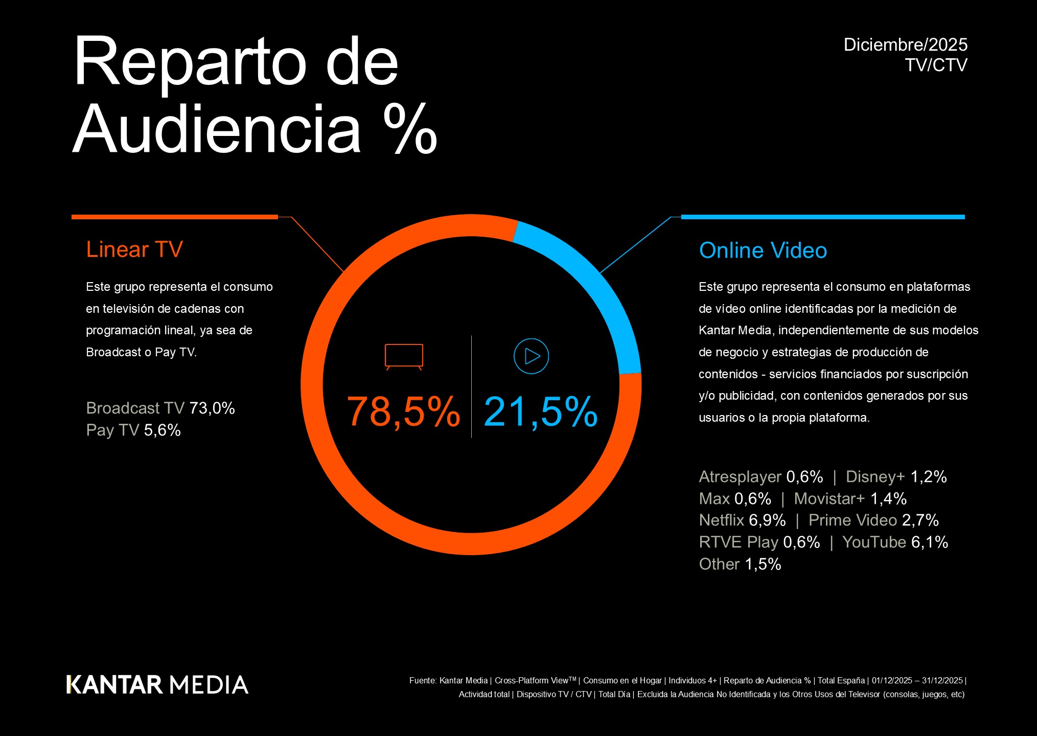 Kantar Media ha publicado los datos de consumo audiovisual en los hogares españoles correspondientes al mes de diciembre de 2025. Según los resultados de Cross-Platform View, la audiencia de televisión lineal y de plataformas de streaming se muestra constante, con un ligero aumento en la visualización a través de televisores conectados (CTV).