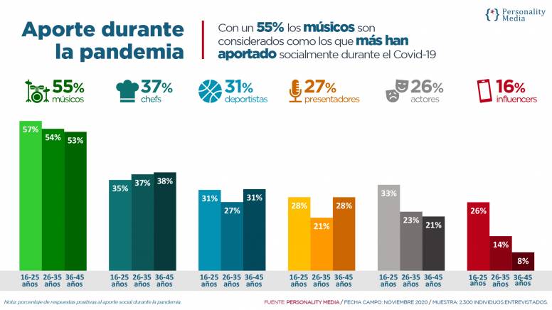 Un aplastante 55% de consumidores considera que los músicos han hecho un mayor aporte social durante los momentos complejos. Hemos disfrutado de conciertos virtuales y de distintas versiones para levantar el ánimo que, sin duda, han calado hondo en la sociedad. Tanto el 47% de hombres como el 62% de las mujeres, reconoce el aporte social de los músicos, incluso para los jóvenes, con un 57%, siguen siendo la mejor opción.