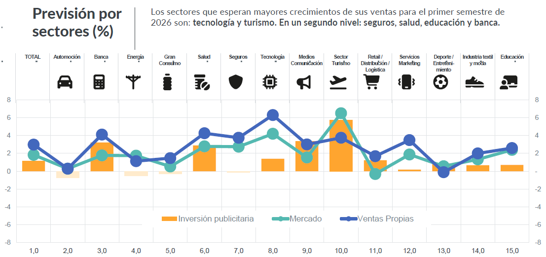 De cara a los primeros seis meses de 2026, el informe dibuja un escenario desigual por sectores. Turismo y tecnología vuelven a liderar las previsiones de crecimiento, con expectativas muy elevadas, seguidos por seguros, salud y educación, que anticipan avances por encima de la media. En un segundo grupo se sitúan banca, energía, servicios de marketing, medios y moda, con crecimientos moderados. Gran consumo y deporte/entretenimiento prevén incrementos más contenidos, mientras que automoción y retail son los más pesimistas, sin expectativas de crecimiento e incluso con riesgo de retroceso.