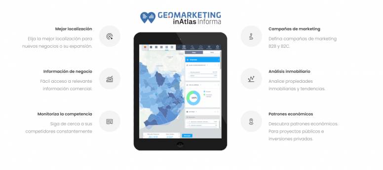 Su solución de Geomarketing permite tener acceso a 4,3 millones de empresas en España y Portugal y a perfiles sociodemográficos actualizados continuamente, aportando más información sobre los clientes actuales y facilitando encontrar nuevos. Con su servicio de Data Analytics ofrece a las empresas servicios automatizados para normalizar y enriquecer sus bases de datos, así como detectar de forma inmediata la mejor ubicación para el éxito de los negocios, a través de la gestión automatizada de más de 500 indicadores.