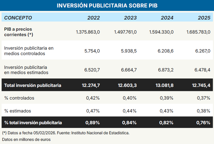 Pese al crecimiento económico, la inversión publicitaria pierde peso sobre el PIB. El total pasa del 0,82% en 2024 al 0,76% en 2025. Tanto los medios controlados como los estimados reducen su participación: los primeros descienden del 0,39% al 0,37%, y los segundos del 0,43% al 0,38%.